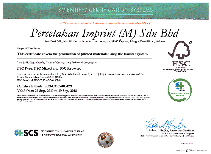 Percetakan Imprint (M) Sdn Bhd has obtained certification with the Forest Stewardship Council (FSC) Chain of Custody Standards. FSC is a not-for-profit membership-based organisation that brings people together to find solutions to the problems of bad forestry practice. The assurance standards is to ascertain that the paper used can be traced back to forests where these products are harvested from,
